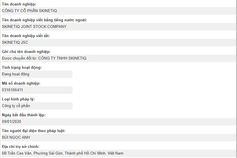 Theo thông tin từ Cổng thông tin quốc gia về đăng ký doanh nghiệp, Skinetiq có tên đầy đủ là Công ty cổ phần Skinetiq được thành lập vào ngày 9/1/2020, có trụ sở tại TP.HCM. Người đại diện theo pháp luật của doanh nghiệp này là ông Bùi Ngọc Anh. Ngành nghề kinh doanh chính của Skinetiq là Bán lẻ thuốc, dụng cụ y tế, mỹ phẩm và vật phẩm vệ sinh.