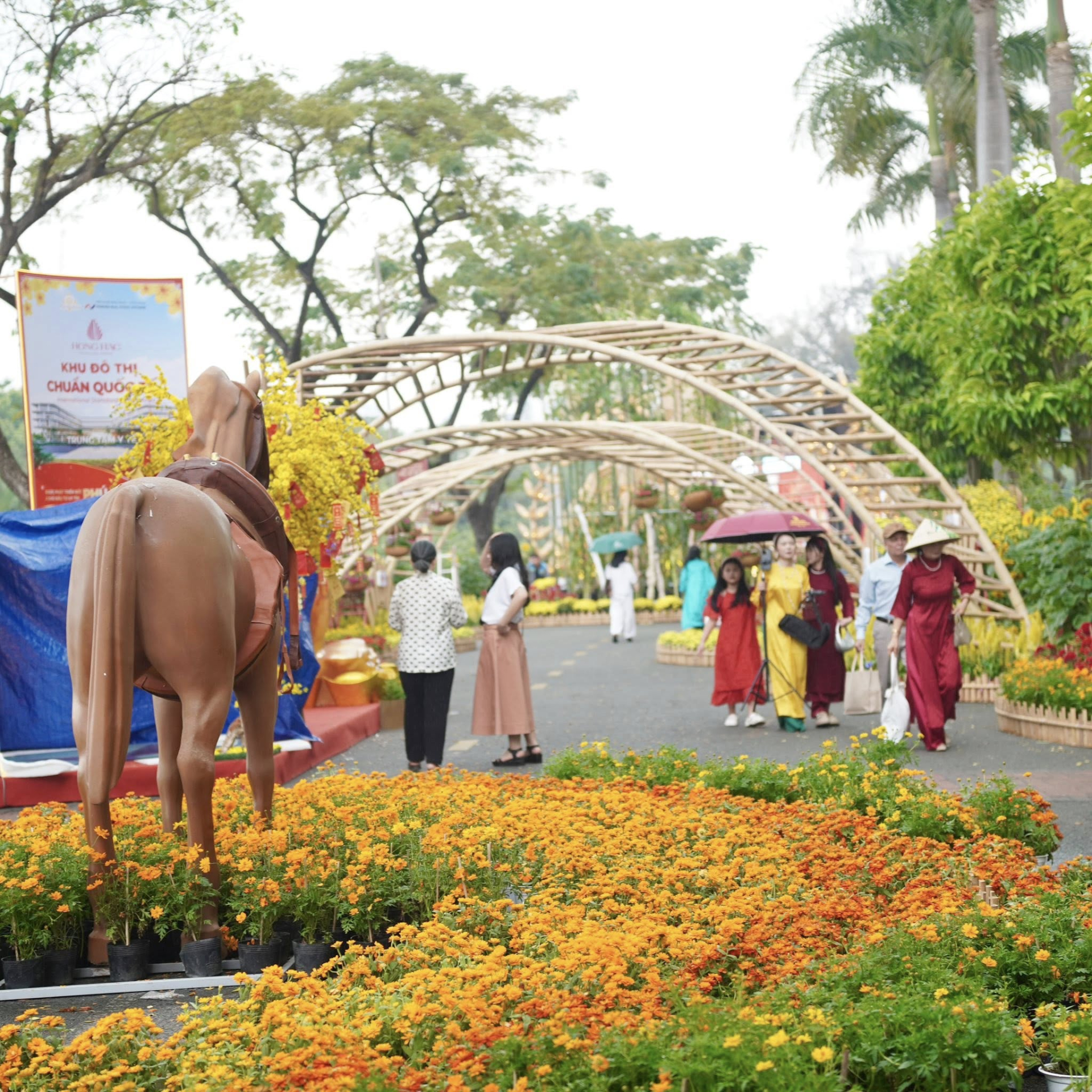 Sức hút của đường hoa Phú Mỹ Hưng năm nay nằm ở chủ đề "Vươn mình" với điểm nhấn là mô hình tuyến Metro cách điệu uốn lượn trên cao, mang theo những biểu tượng đặc trưng của TP.HCM, Bình Dương và Vũng Tàu. Bên cạnh đó, các linh vật ngựa được bài trí khắp nơi, từ ngựa phi nước đại dũng mãnh ở cổng chào cho đến tượng Thánh Gióng uy nghi đều khiến du khách phải trầm trồ.