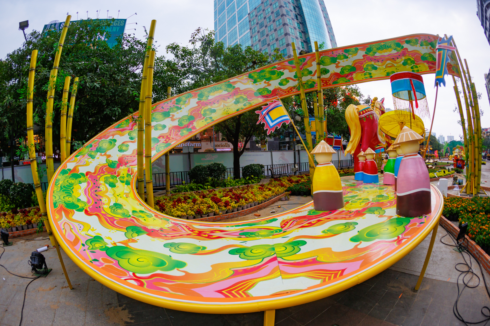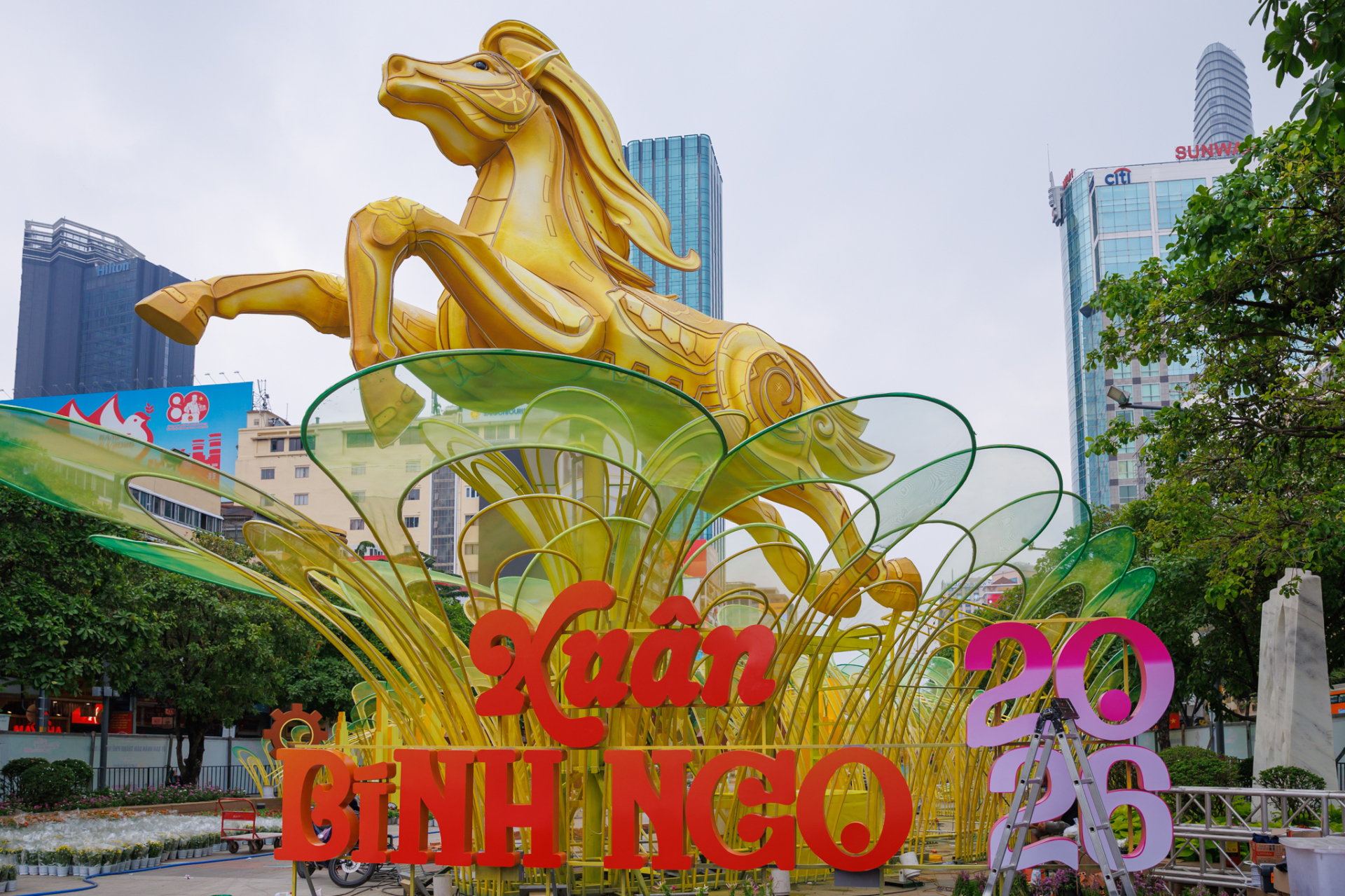 Điểm cuối cùng trong hành trình 1 ngày này chắc chắn không thể thiếu "anh cả" đường hoa Nguyễn Huệ. Tâm điểm khiến ai nấy đều mong ngóng chính là đại cảnh linh vật ngựa tại cổng chào với tổng chiều cao lên đến 11m, được thi công tinh xảo để sẵn sàng cho giờ mở cửa vào tối 28 Tết.