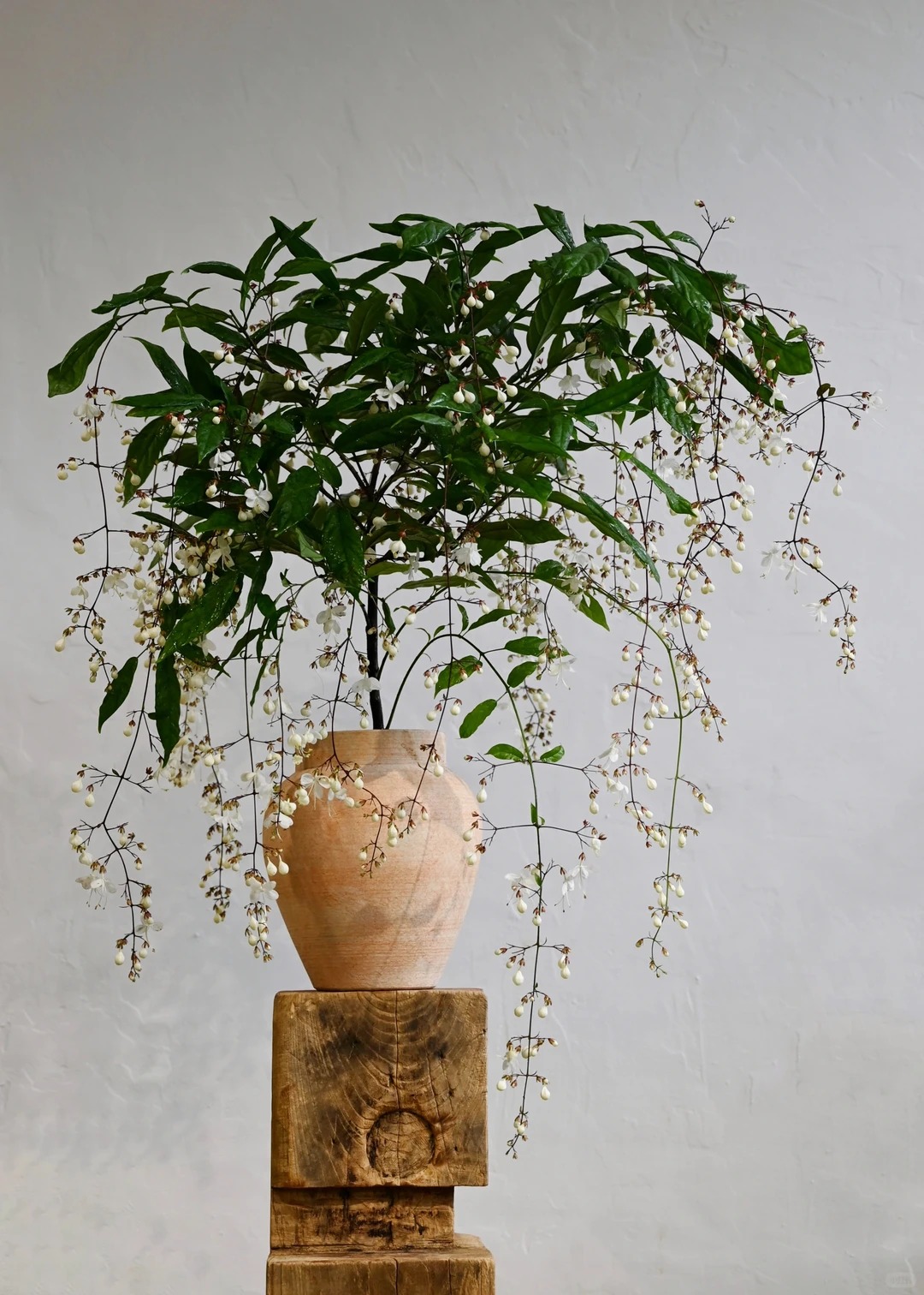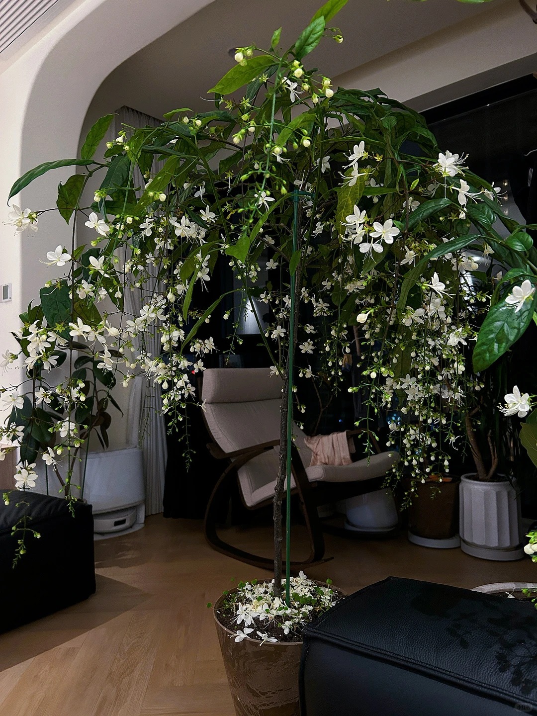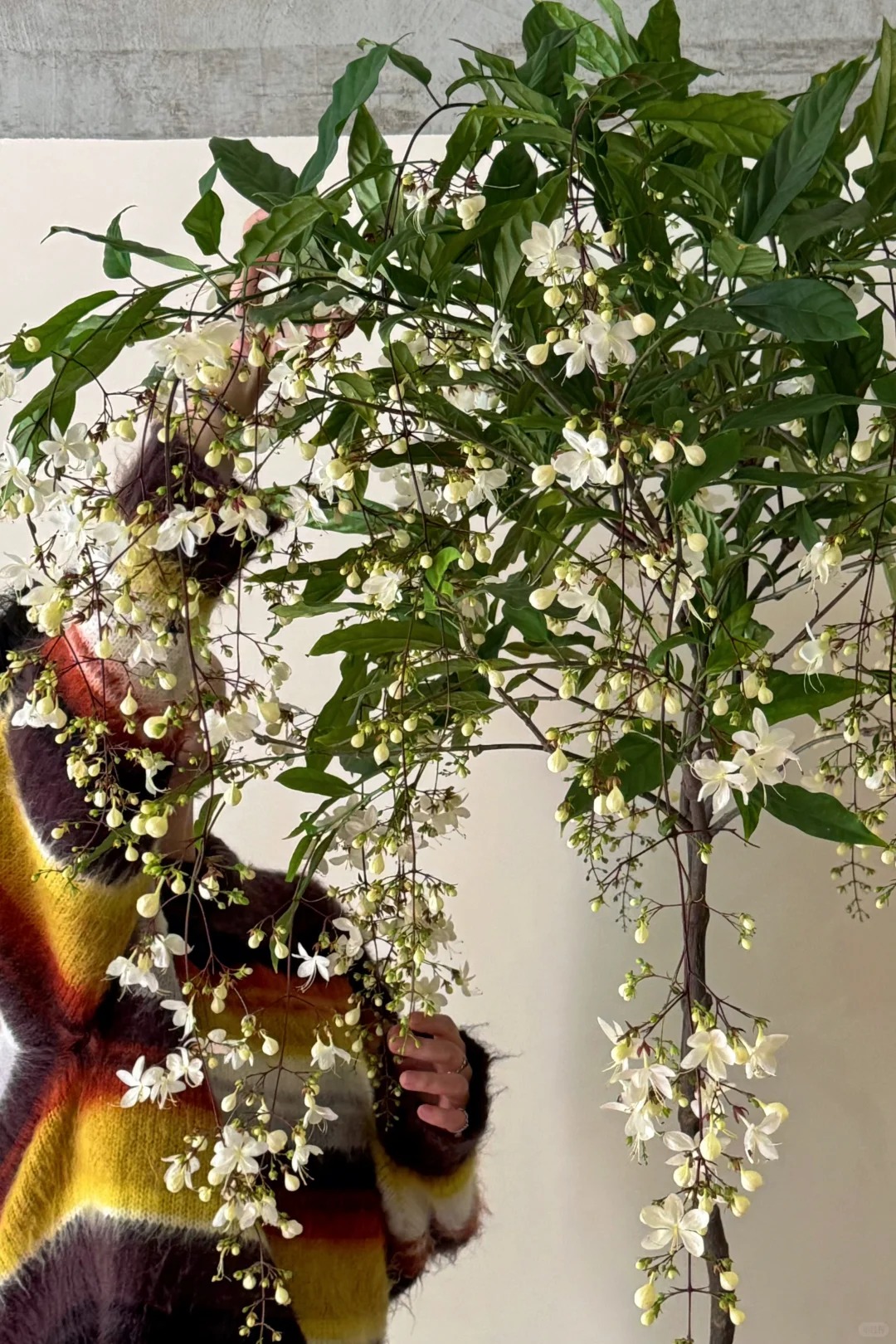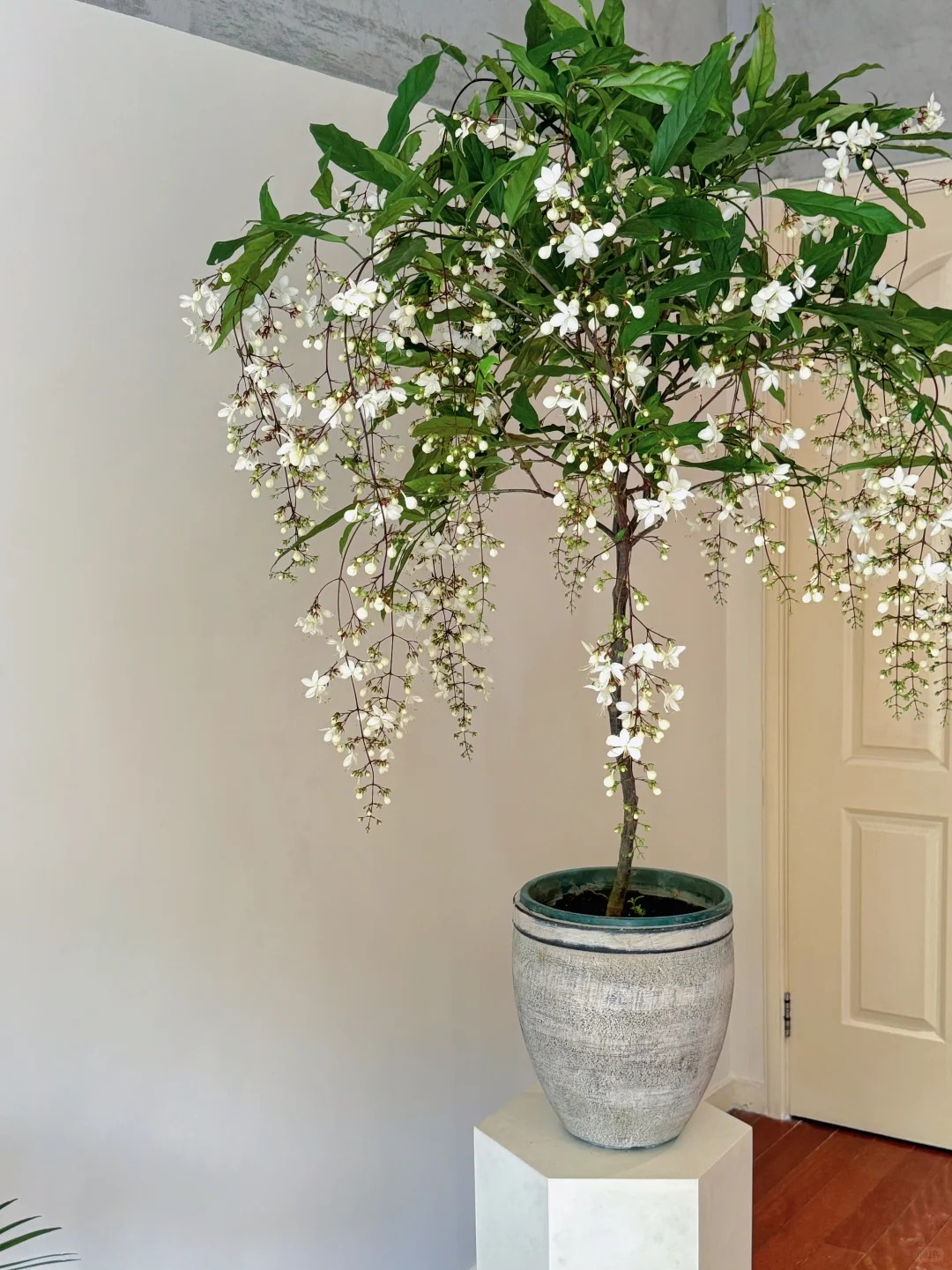 Có lẽ chưa bao giờ tôi thấy một loài thực vật nào lại khiến mình rung động mạnh đến thế, cảm giác như đang ngắm nhìn một "nàng thơ" bước ra từ cổ tích vậy. Cây Dạ Ngọc Minh Châu (hay còn được dân chơi cây gọi là Clerodendrum wallichii ) thực sự là một kiệt tác của tạo hóa. Không vươn thẳng ngạo nghễ, cành của nó mềm mại, buông lơi một cách tự nhiên, đầu cành trĩu nặng những chuỗi nụ tròn xoe như những viên ngọc trai. Khi nở, từng bông hoa trắng muốt bung ra, nhìn từ xa hệt như hàng ngàn con bướm trắng đang đậu trên cành, hay lãng mạn hơn là một chiếc rèm châu sa lộng lẫy bên khung cửa sổ. Đặt một chậu trong nhà, cảm giác không gian sống bỗng chốc trở nên "tình" hơn, sang trọng hơn và đậm chất nghệ thuật, đúng chuẩn cái gu "lifestyle" mà chị em mình vẫn mê mẩn trên Instagram hay Pinterest.