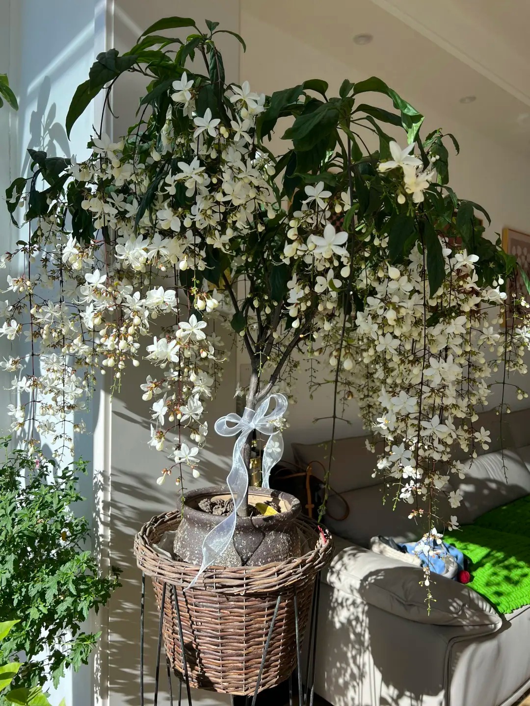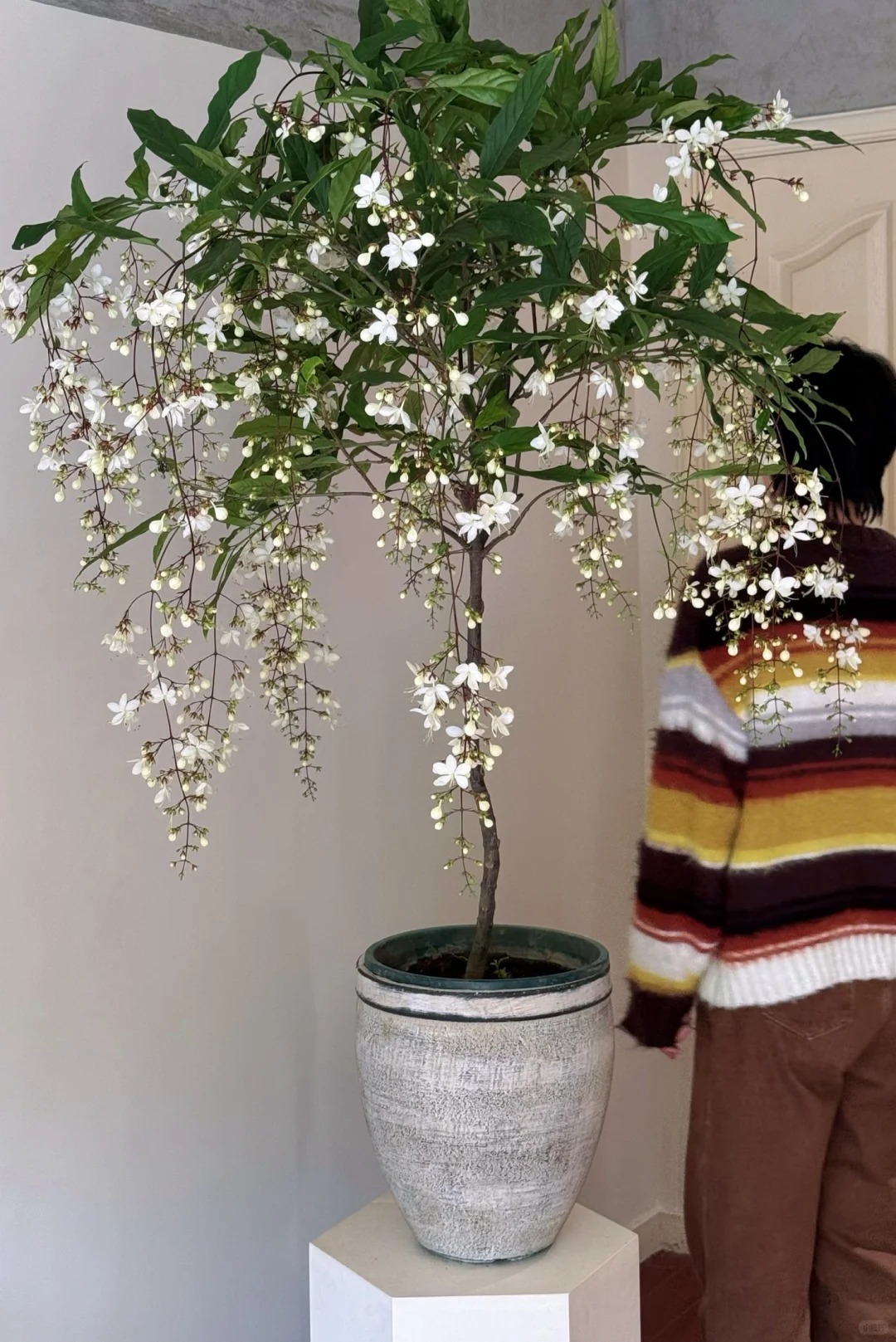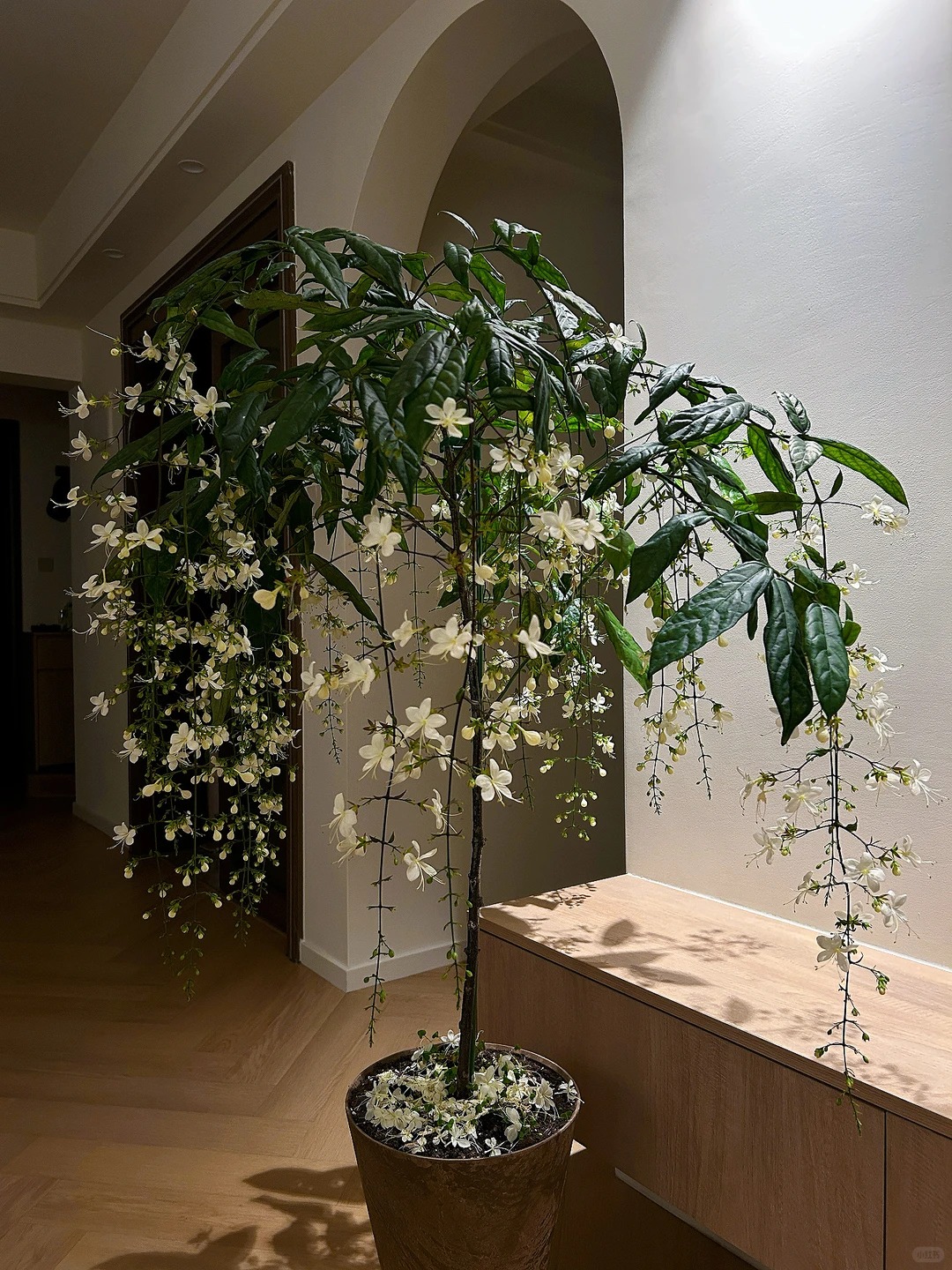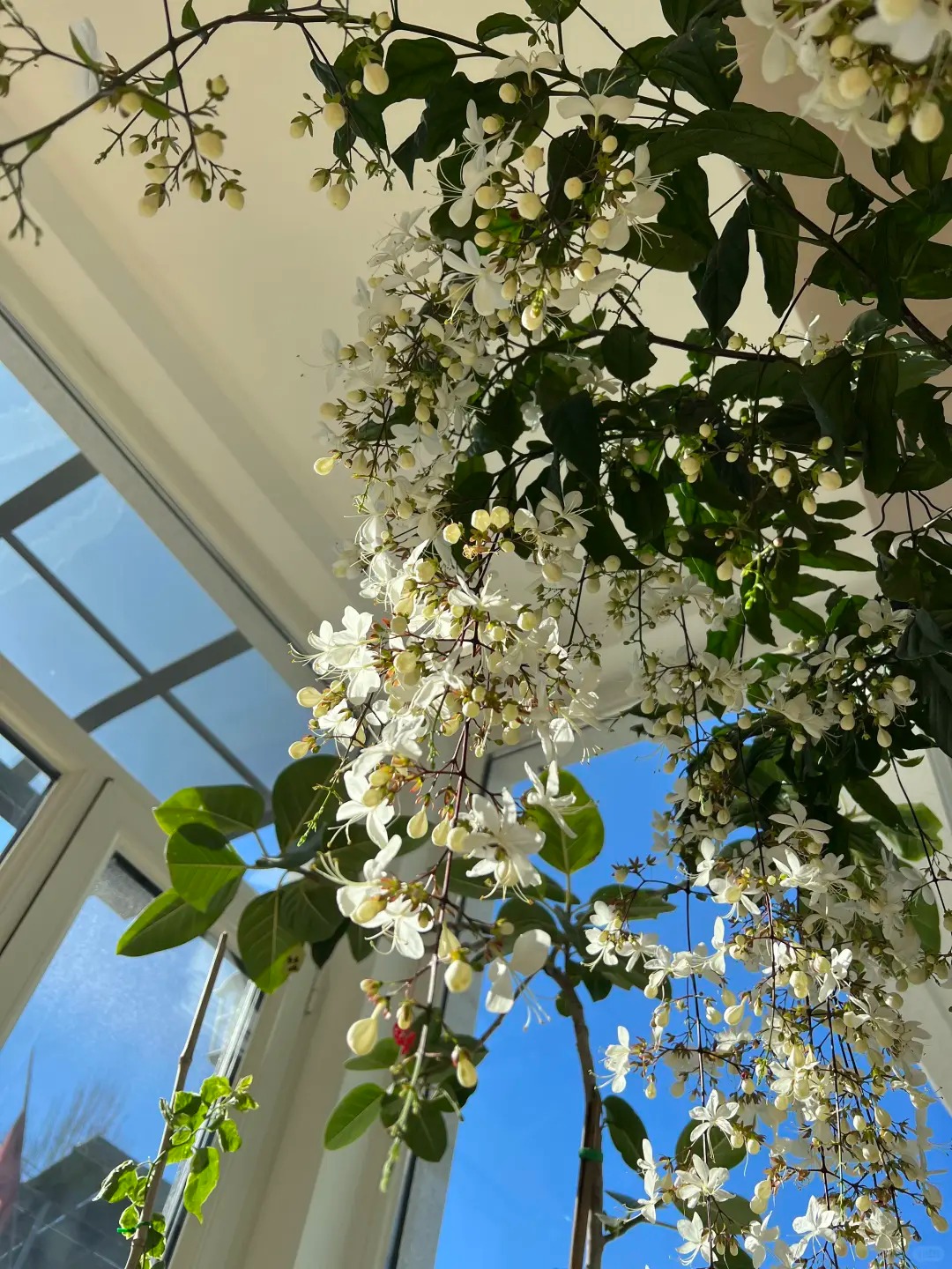Có lẽ chưa bao giờ tôi thấy một loài thực vật nào lại khiến mình rung động mạnh đến thế, cảm giác như đang ngắm nhìn một "nàng thơ" bước ra từ cổ tích vậy. Cây Dạ Ngọc Minh Châu (hay còn được dân chơi cây gọi là Clerodendrum wallichii ) thực sự là một kiệt tác của tạo hóa. Không vươn thẳng ngạo nghễ, cành của nó mềm mại, buông lơi một cách tự nhiên, đầu cành trĩu nặng những chuỗi nụ tròn xoe như những viên ngọc trai. Khi nở, từng bông hoa trắng muốt bung ra, nhìn từ xa hệt như hàng ngàn con bướm trắng đang đậu trên cành, hay lãng mạn hơn là một chiếc rèm châu sa lộng lẫy bên khung cửa sổ. Đặt một chậu trong nhà, cảm giác không gian sống bỗng chốc trở nên "tình" hơn, sang trọng hơn và đậm chất nghệ thuật, đúng chuẩn cái gu "lifestyle" mà chị em mình vẫn mê mẩn trên Instagram hay Pinterest.