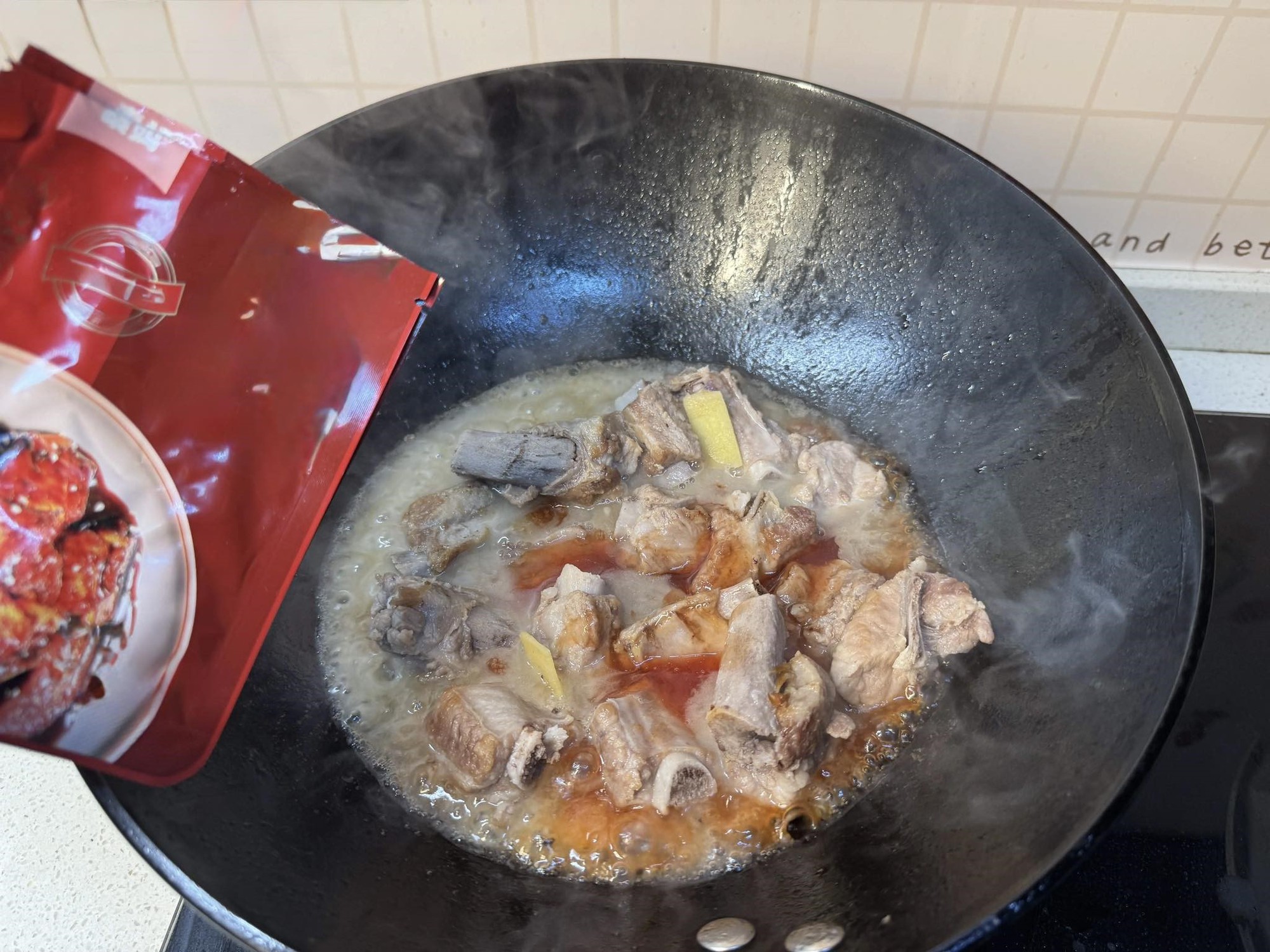 Bước 3: Khi nước dùng đã gần cạn, bạn hòa tinh bột bắp vào với chút nước rồi cho vào nồi sườn. Tiếp theo thêm nước tương đen để tạo màu, và thêm 2 gói gia vị sốt chua ngọt. Sử dụng sốt chua ngọt đóng sẵn đảm bảo hương vị chuẩn, không cần phải nêm thêm gia vị cầu kỳ. Khi bạn chưa thuần thục nấu món ăn và không biết cách làm phần sốt chua ngọt thì đây là giải pháp trọn vẹn. Sốt chua ngọt đóng sẵn có vị gần giống hệt như ở nhà hàng.