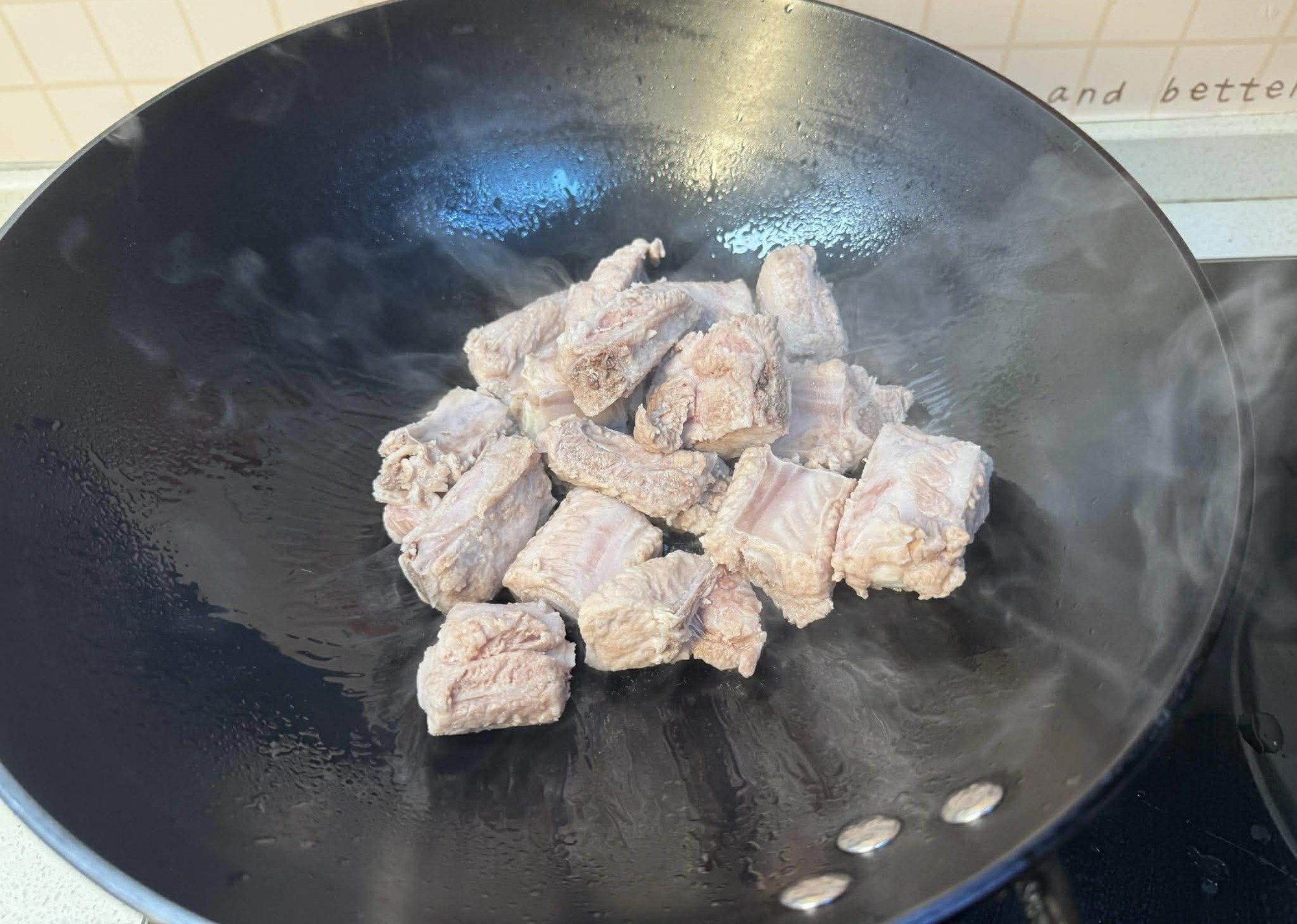 Bước 1: Khi mua sườn heo, bạn hãy chọn phần giữa. Phần này mềm và có hình dáng đẹp, là lựa chọn tốt nhất cho món sườn heo chua ngọt. Sau khi mua về, bạn rửa sạch rồi chặt thành khúc vừa ăn. Tiếp theo cho sườn heo vào nồi nước, đun sôi. Sau đó tắt bếp rồi vớt sườn ra, rửa sạch để loại bỏ bọt máu cùng tạp chất. Sau đó dùng khăn bếp thấm khô sườn.