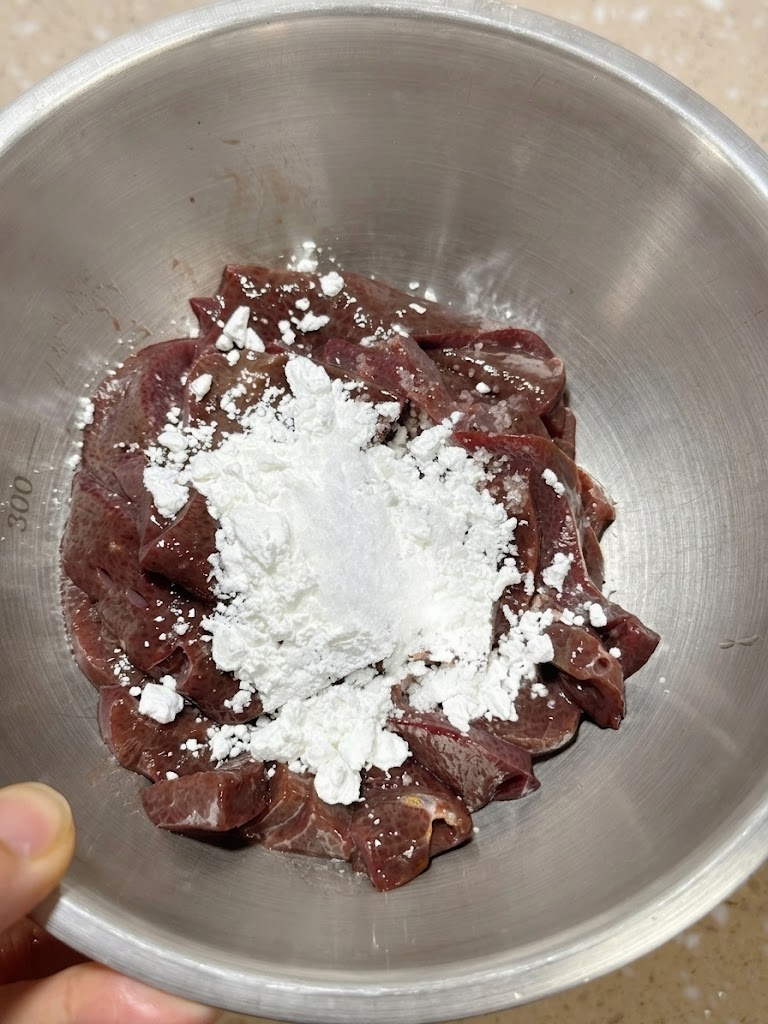 Khi mua gan lợn về, bạn hãy thái thành những lát mỏng vừa ăn, sau đó cho vào bát và bắt đầu quá trình "làm sạch sâu". Hãy dùng một chút bột năng (hoặc bột bắp), muối hạt và một thìa rượu nấu ăn để trộn đều, ướp nhẹ nhàng mẻ gan này. Sự kết hợp này sẽ giúp khử đi hoàn toàn mùi hôi, đồng thời đẩy hết những máu thừa cặn bẩn bên trong cấu trúc gan ra ngoài.