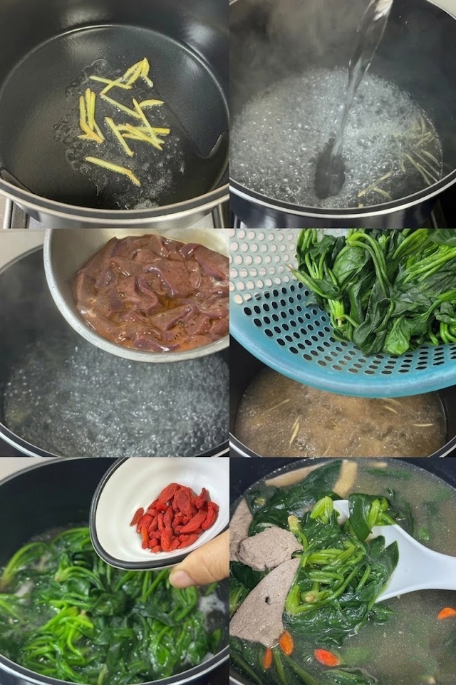 Khi mọi nguyên liệu đã sẵn sàng, bạn đặt một chiếc nồi nhỏ lên bếp, đun nóng chút dầu ăn rồi cho gừng thái chỉ vào phi thật thơm. Mùi gừng ấm nồng bốc lên cũng là lúc bạn đổ nước sôi vào nồi, tiếp tục trút phần gan lợn đã tẩm ướp cùng cải bó xôi và một nhúm kỷ tử vào. Lúc này, bạn chỉ cần đợi nồi canh sôi bùng lên trở lại, nêm nếm thêm chút gia vị cho vừa miệng là có thể tắt bếp ngay lập tức. Đừng đun quá lâu để tránh làm gan bị cứng và rau bị nhũn mất đi vitamin nhé.