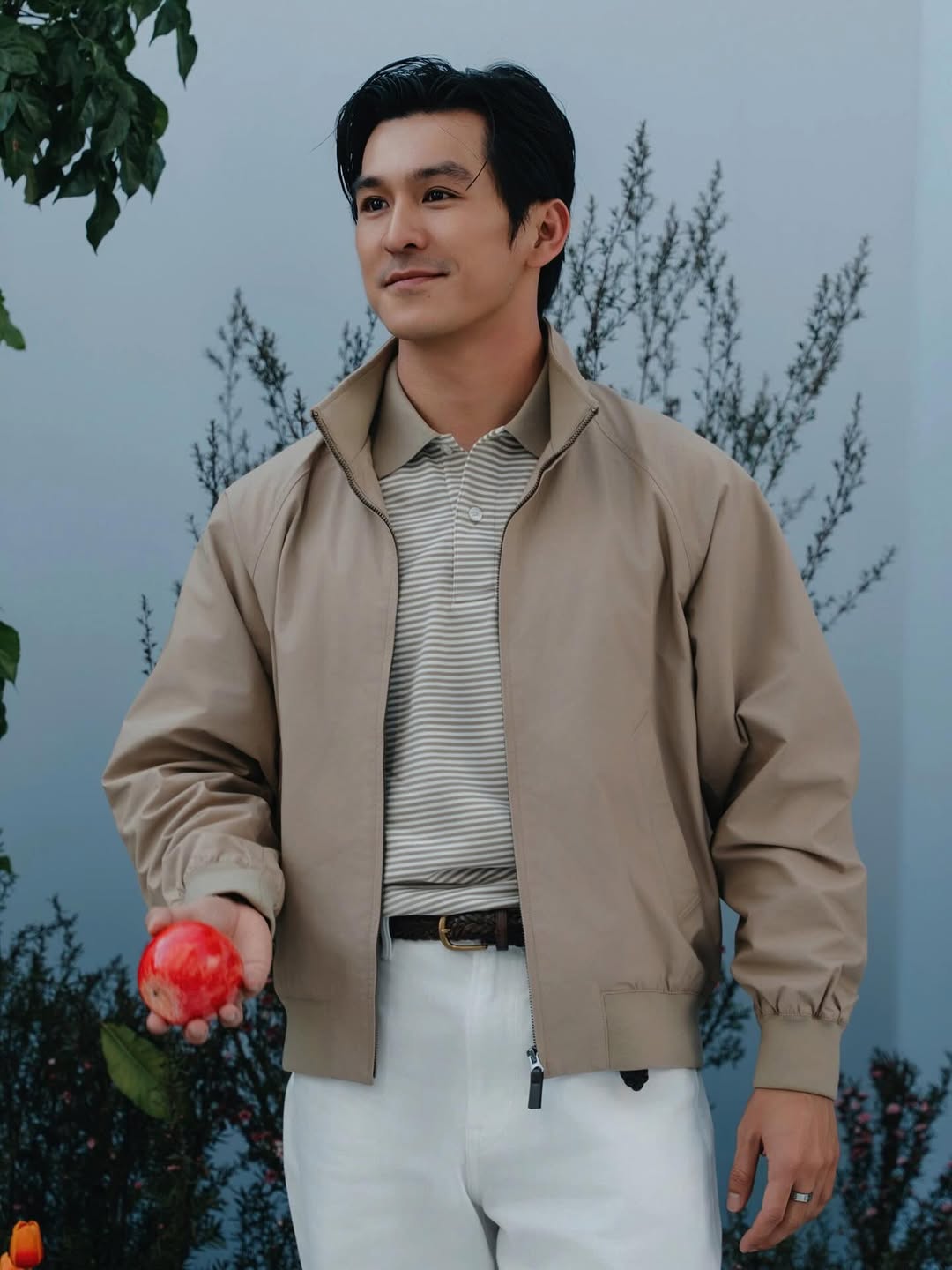 Sự lựa chọn của quý ông Thiên Minh chính là thiết kế mới nhất trong BST Xuân/Hè của UNIQLO - áo khoác Harrington. Độ dài áo được tính toán chuẩn mực, vừa đủ để tạo tỷ lệ đẹp cho vóc dáng, vừa khéo léo nâng tầm tổng thể mà không cần đến quá nhiều chi tiết cầu kỳ. Cách dựng thẳng cổ áo cũng giúp tổng thể thêm gọn gàng và có điểm nhấn - cách phối thông minh khi layer áo khoác có cổ bên ngoài polo