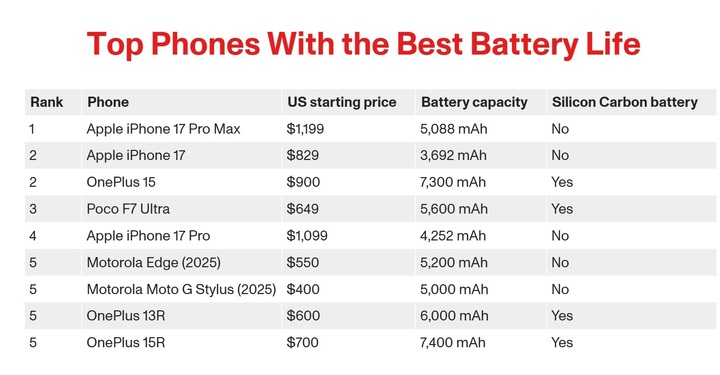 Bảng xếp hạng các dòng điện thoại có thời lượng pin tốt nhất theo đánh giá của CNET. (Ảnh: CNET)